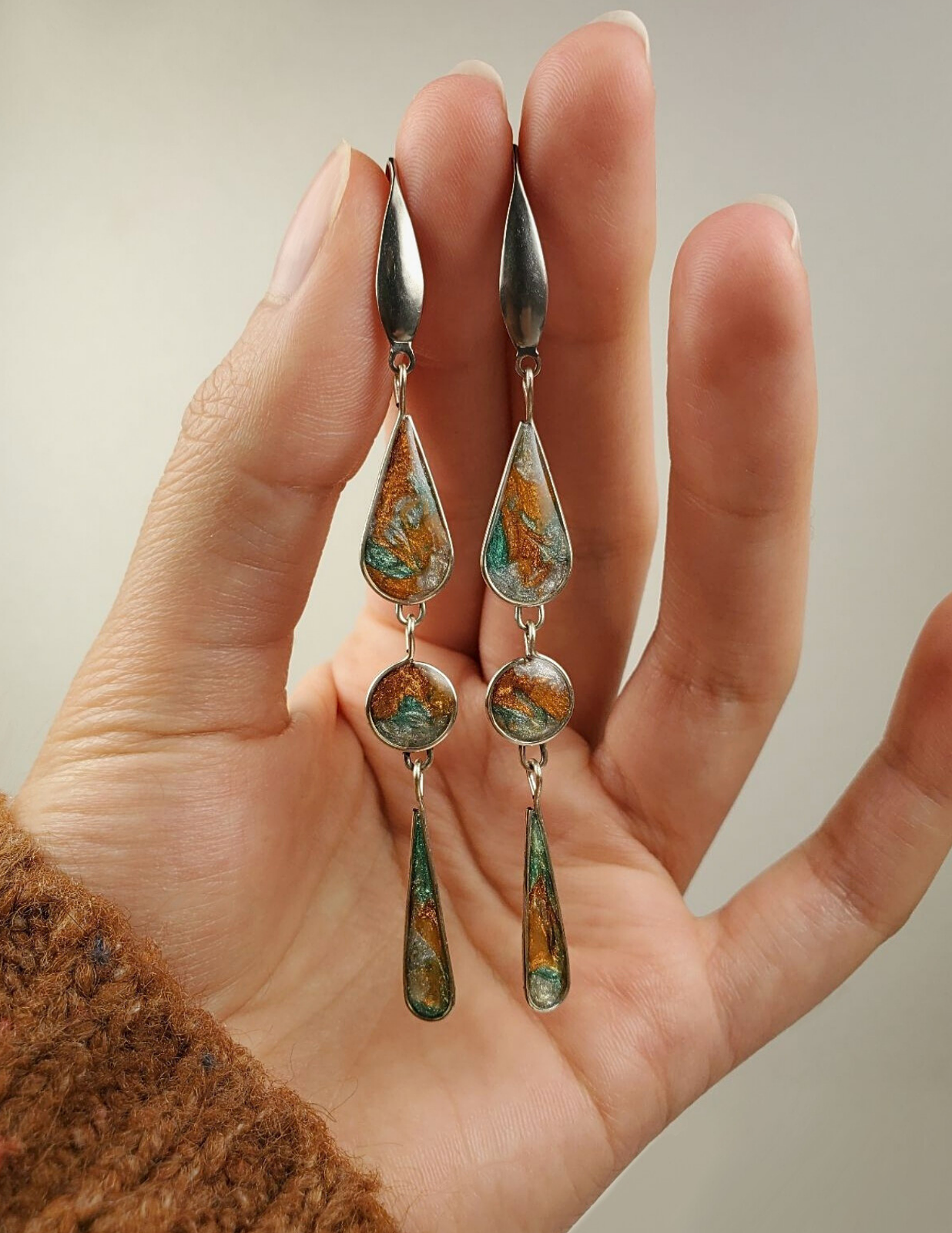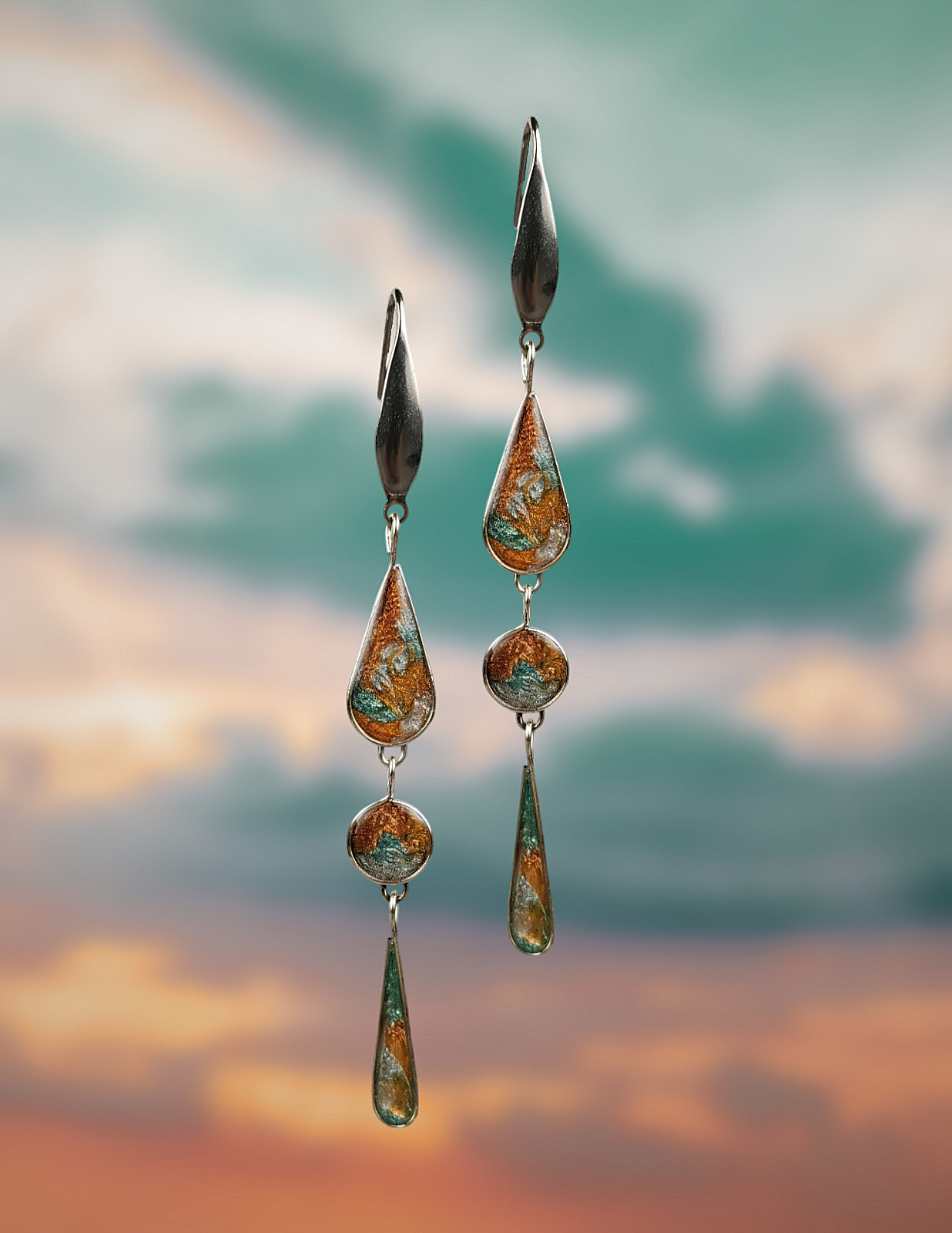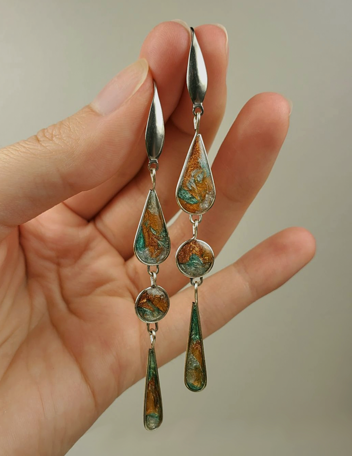Dainty circles and slim teardrops colored in a combination of teal, orange, and white.