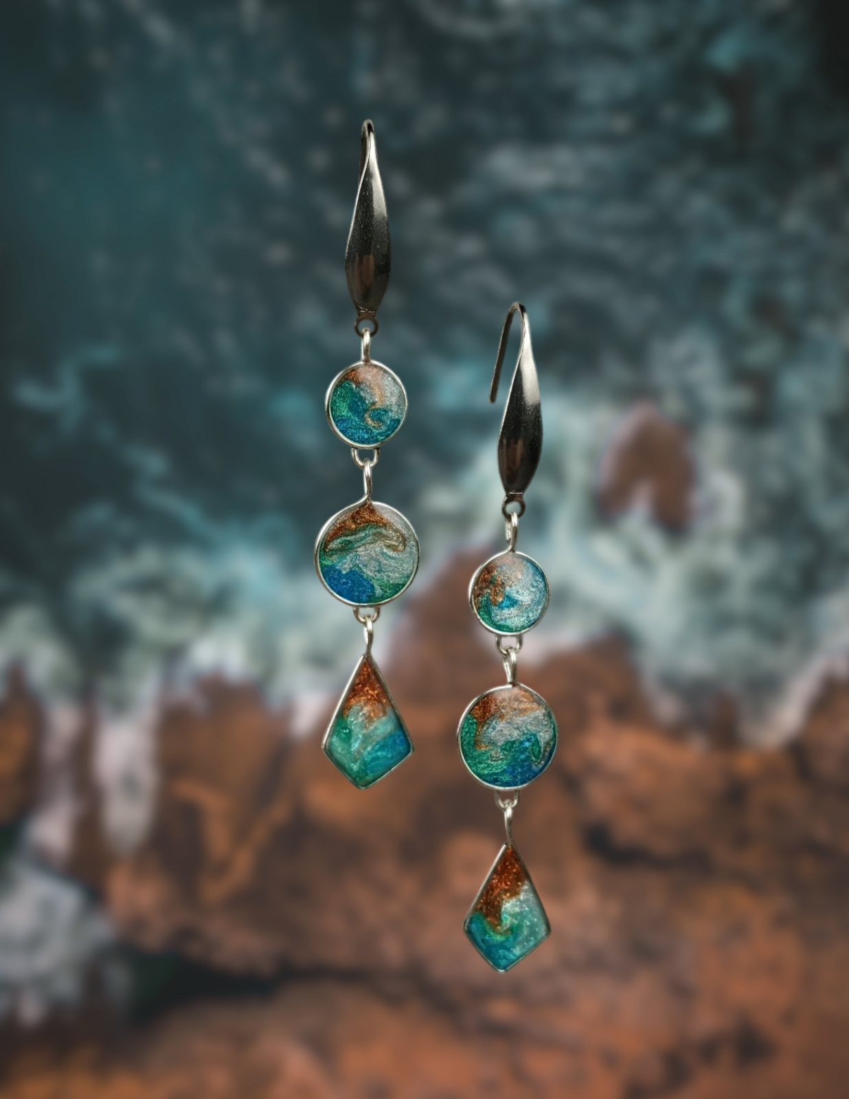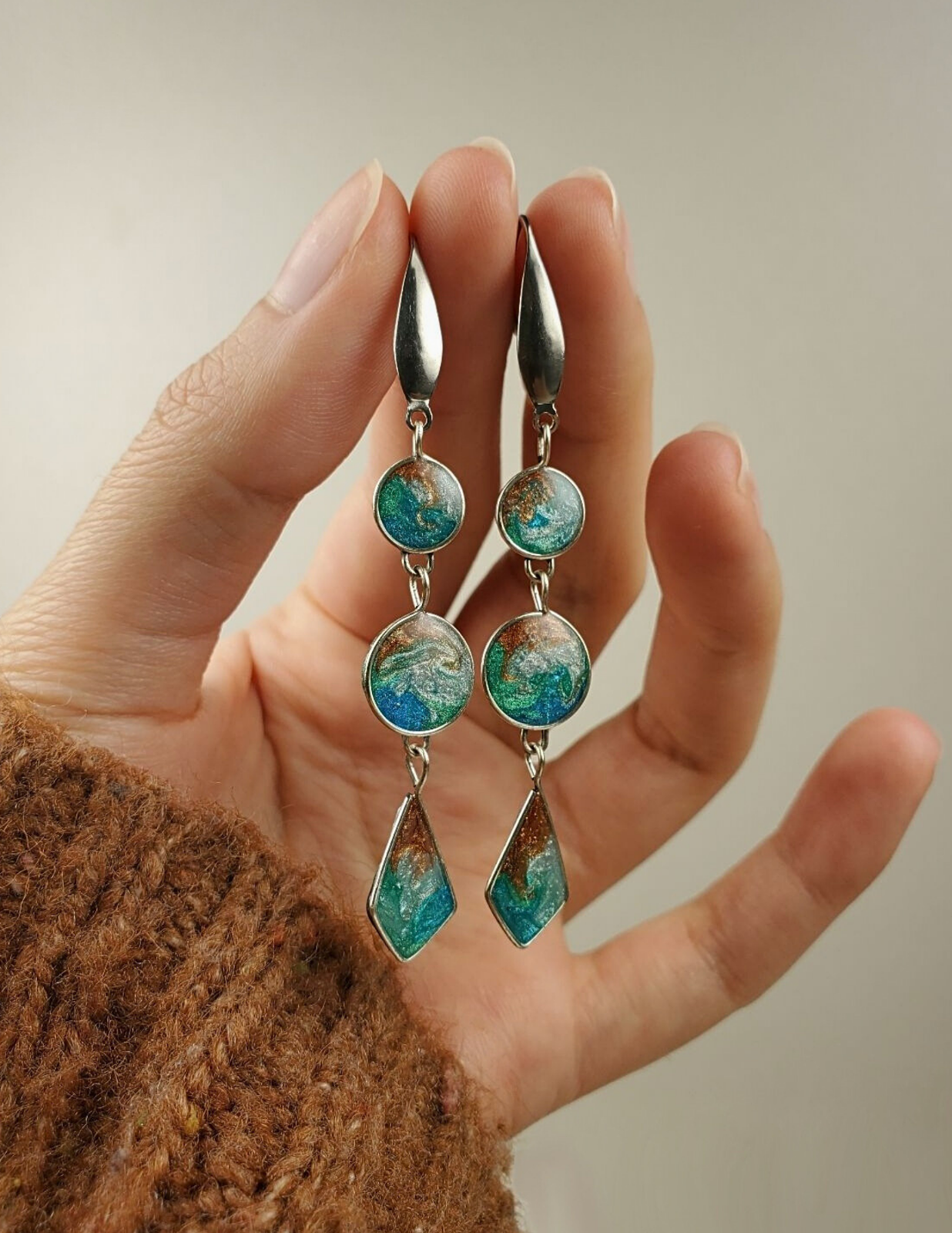 Delicate triple-tiered earrings in shades of blue and green with little hints of bronze.