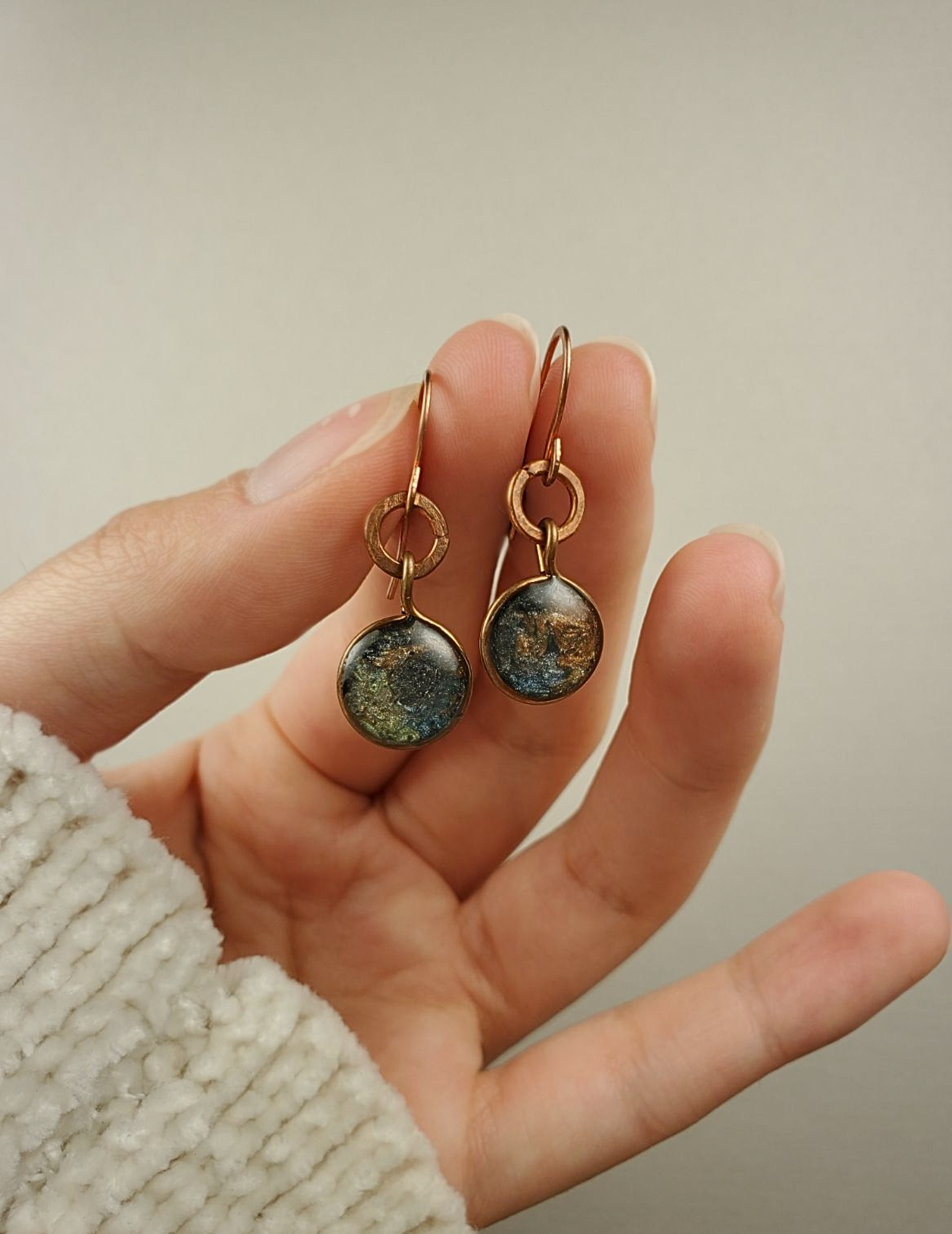 Circles colored in a captivating combination of navy blue, green, and orange descend from textured copper rings.